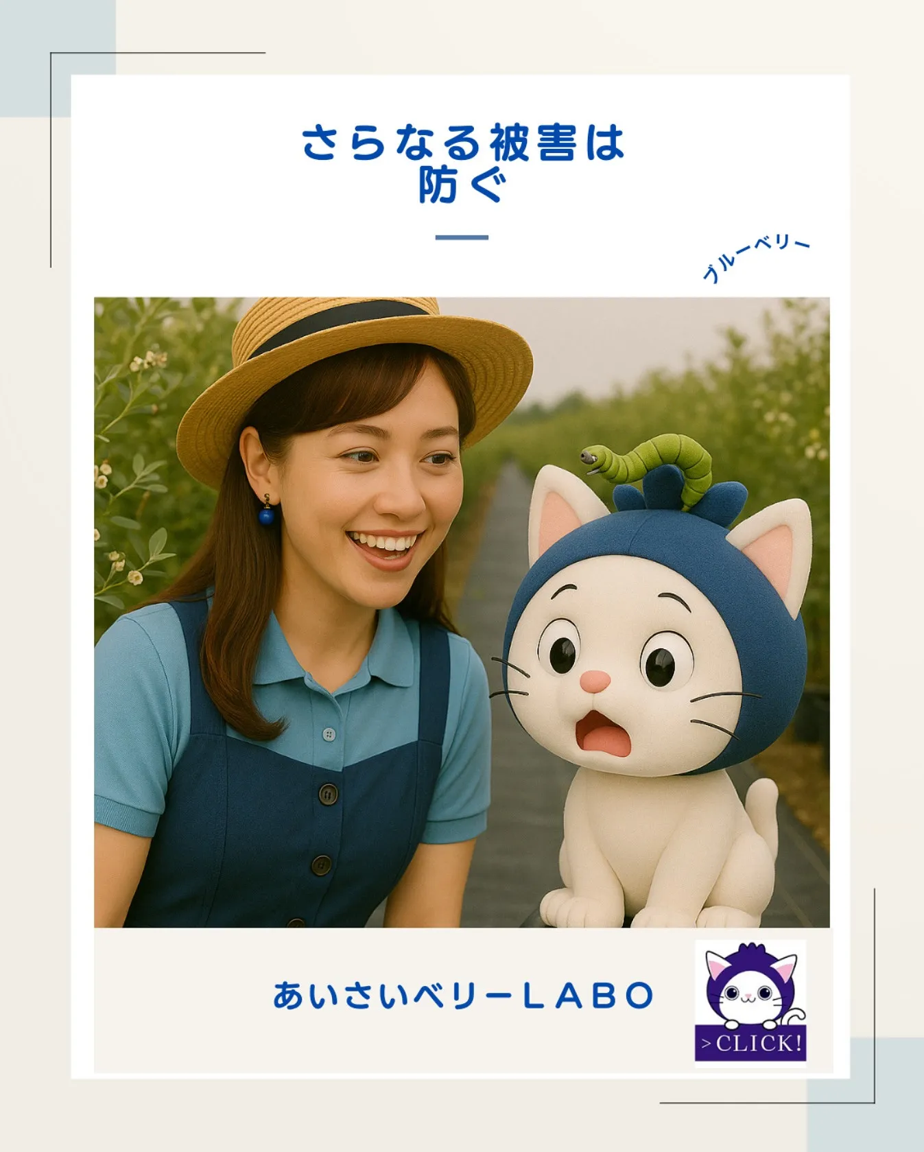 この雨のあとはしばらく雨予報はなく、虫が活発化します。アブラムシ、シャクトリムシ等々。さらなる被害を防ぐべく、見回りし、手で潰していきます。あいさいベリーLABOはブルーベリーでは農薬は使いません。