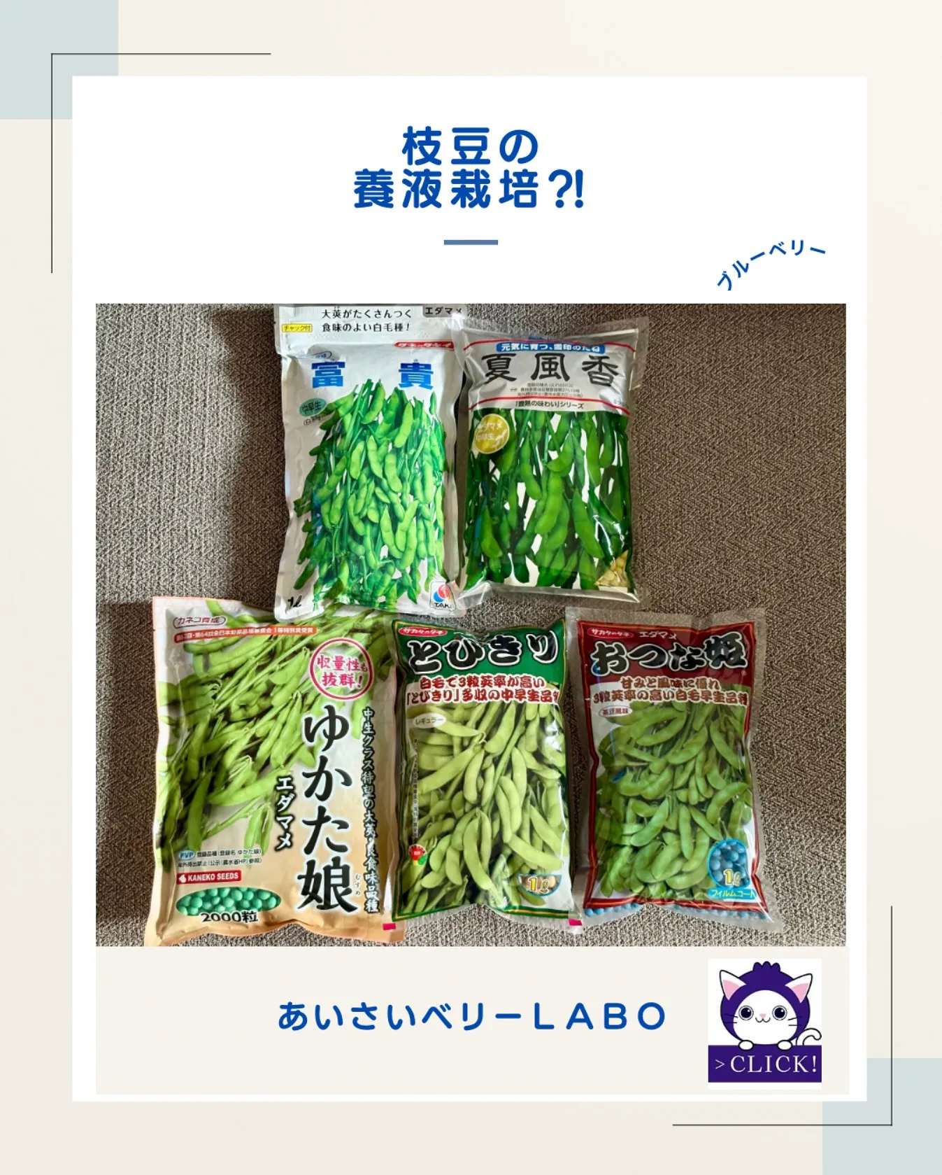 枝豆も少しだけ養液栽培 枝豆も少しだけ養液栽培枝豆の白毛種が揃いました。暑さに強い品種を多くしました。当園はブルーベリーの収穫期が終わるお盆以降と抑制栽培での10月の収穫も狙います。黒豆もすでに来ていますが、茶豆が…