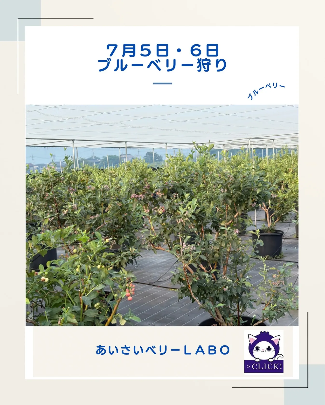 7月5日・6日ブルーベリー狩り 7月5日・6日ブルーベリー狩り6日『日』に予約が集中しています笑5日『土』がたくさん空いていますので、よろしければご予約ください。暑そうなので、暑さ対策はよろしくお願いします。飲み物の持ち…